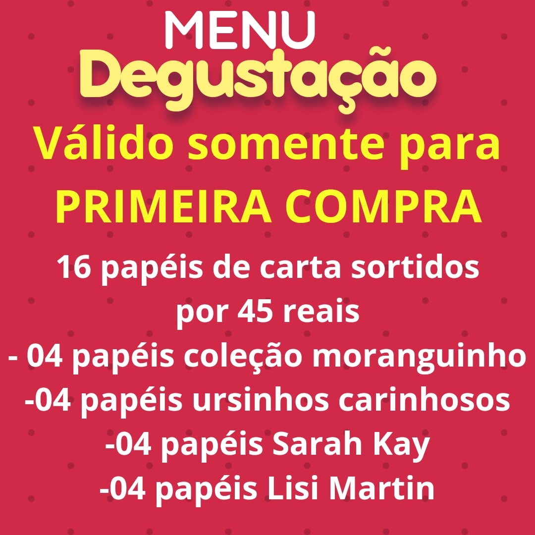 ESTA MODALIDADE É VÁLIDA SOMENTE PARA COLECIONADORAS QUE AINDA NÃO CONHECEM NOSSOS PAPÉIS DE CARTA E FARÃO SUA PRIMEIRA COMPRA.